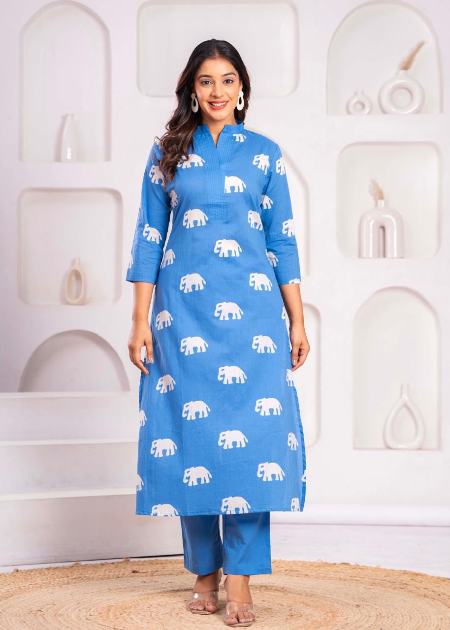 Jayti Aqua Elephant Cotton Kurta Pant Set