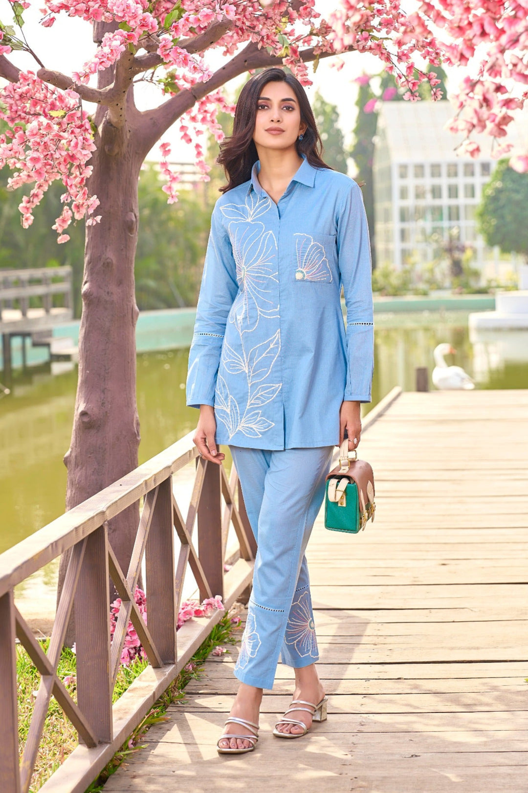 Iyana SoftBlue Embroidery Cotton Co-ord Set